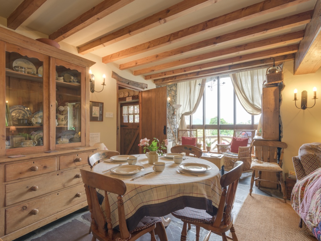 Fully equiped with dining table, dresser, electric cooker, fridge, small freezer, microwave oven, washing machine, toaster etc. The large beams were all carefully chosen. The main beam seen in this picture was from a ship, and was hoisted into position by Roy himself.